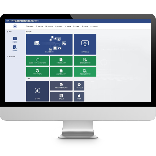 檢材固定、檢材預檢、手機檢驗、監控視頻、數據檢驗、數據匯聚、證據存儲、檢測流程等功能區域。